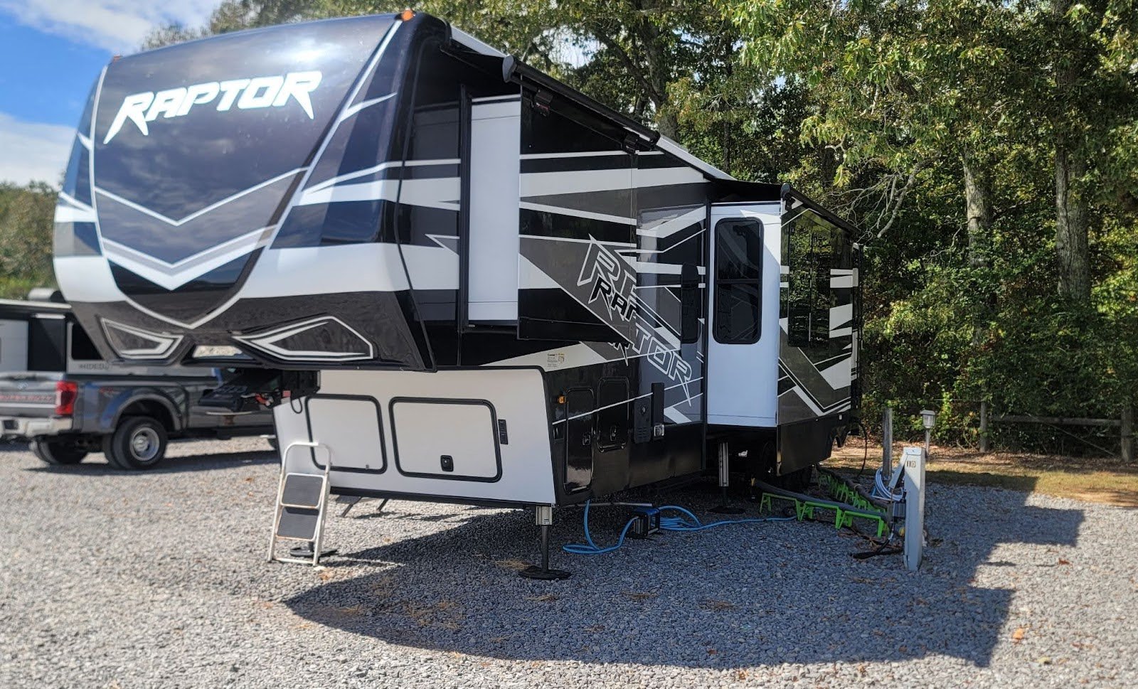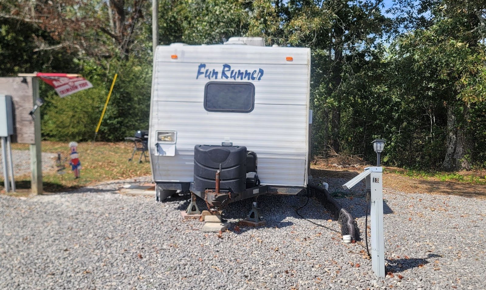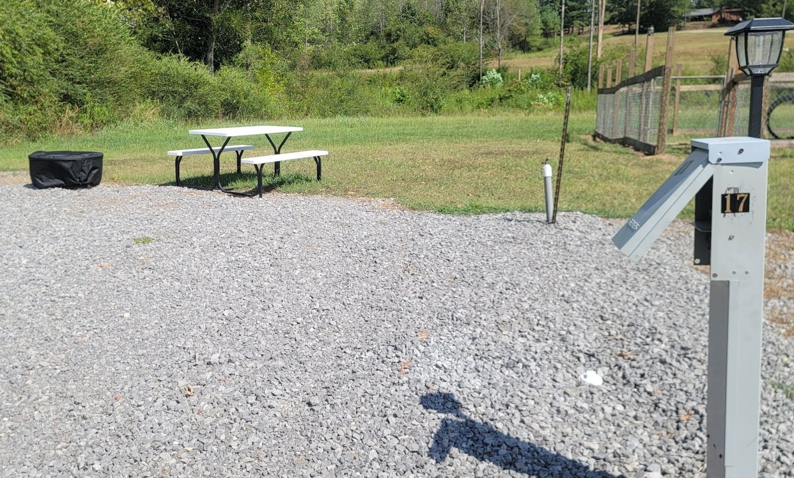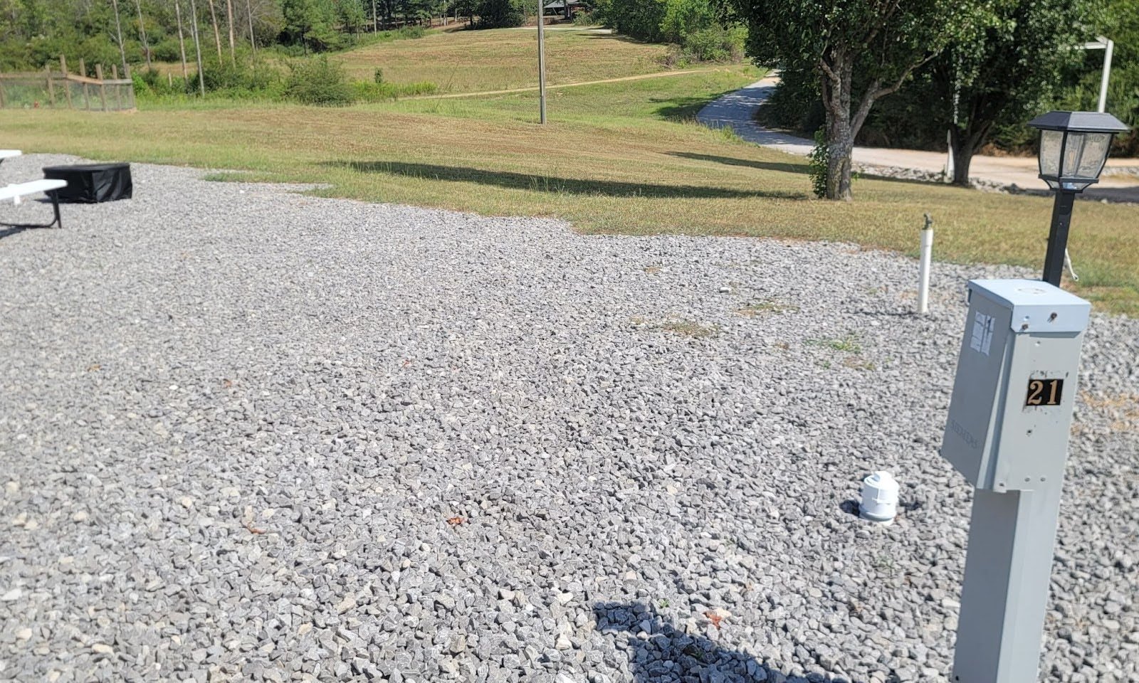 RV Site 21 features a 30×45 gravel pad with an 85% level slope, located 180 feet from the bathhouse and steps from the dog park. This site includes full hookups (30/50-amp, water, sewer), a picnic table, and a fire pit. The general store is nearby, providing easy access to supplies and essentials. Hiking trails, streams, and caves are located on the lower side of the park. WiFi is available throughout the campground.