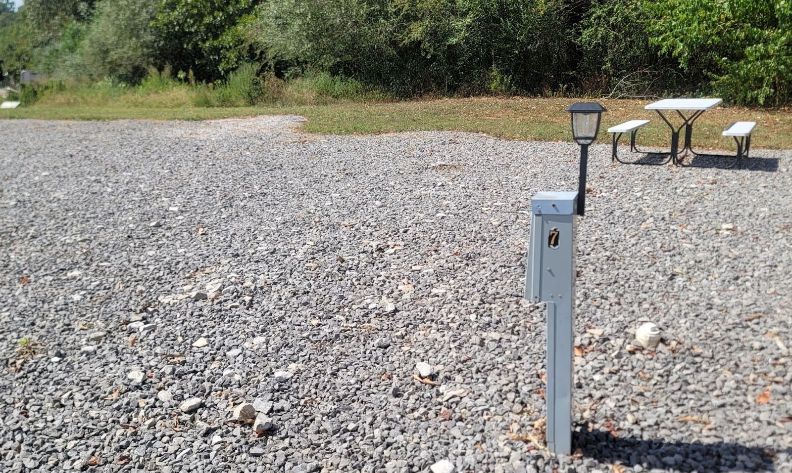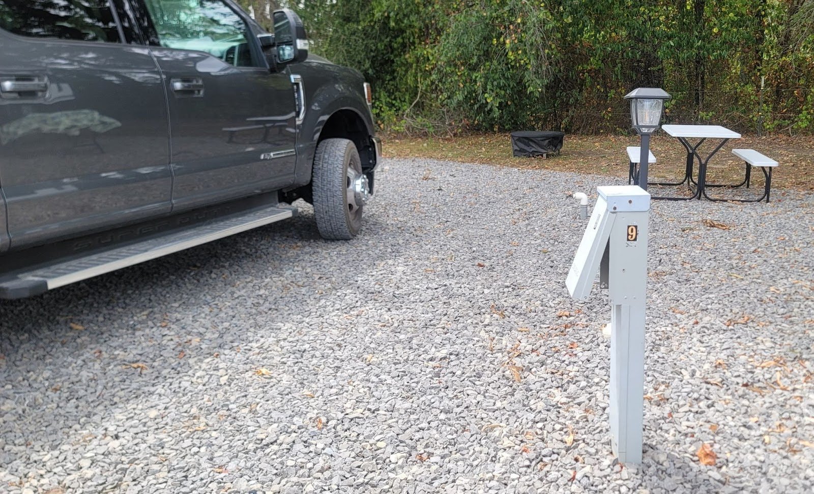 RV Site 9 provides a 30×60 gravel pad with a 95% level slope, located 210 feet from the bathhouse. Full hookups (30/50-amp, water, sewer), a picnic table, and a fire pit are included. The site is close to the general store and park entrance. Hiking trails, streams, and caves are located on the lower side of the park. WiFi is available throughout.